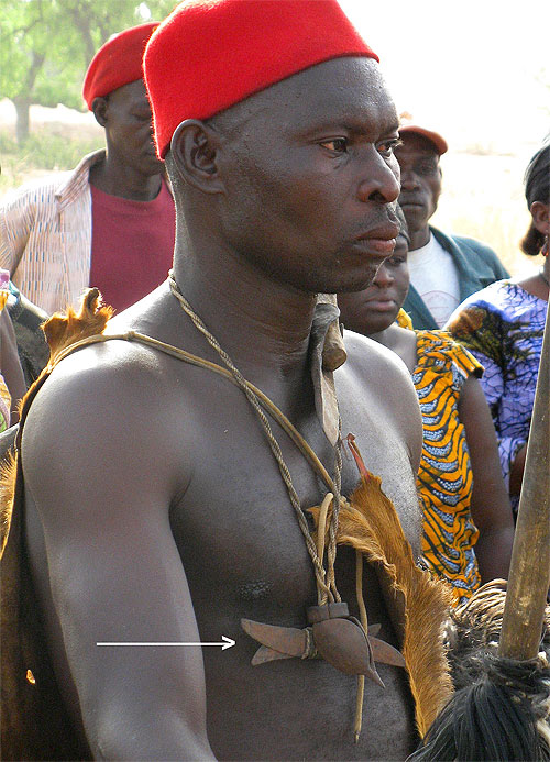 85 Abb. 4 Veröffentlicht 2012-08-24 mit 500 × 693 in Baretule – das „Hexengeld“ der Frafra und Nankani in Nord-Ghana Abb.4: Funeral in Bongo, Kriegstänzer mit zwei Baretule u. Fingerglocke, 04/2010