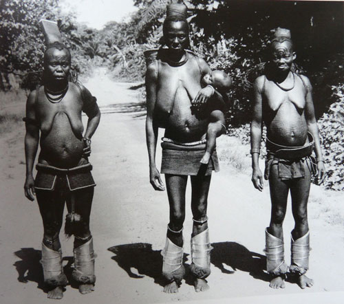 86 Abb. 10 Veröffentlicht 2012-08-23 mit 500 × 442 in Afrikanische Metallreifen als Wertmesser IV: konga – Beinstulpen der Bakutu in der Demokratischen Republik Kongo Abb.10: Drei verheiratete Bakutu – Frauen mit großen konga Beinstulpen. Die Schutzpolsterungen sind gut zu erkennen. (Foto von Lamote , o. J. aus Ballarini, 2009)
