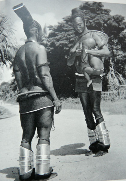 Abb.11: Bakutu – Frauen mit konga Beinstulpen. Wahrscheinlich sind es die gleichen Frauen wie auf Titelbild und Abb.10. Stulpenöffnung vor dem Schienbein getragen. (Foto von Lamote?, ohne Quellenangabe aus a) Rachewiltz, 1965 und b) Haus der Völker Schwaz, Dauerausstellung