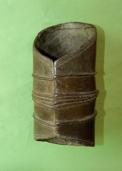 86 Abb. 15 Veröffentlicht 2012-08-23 mit 428 × 600 in Afrikanische Metallreifen als Wertmesser IV: konga – Beinstulpen der Bakutu in der Demokratischen Republik Kongo Abb.15: Eine große konga Beinstulpe in der Ansicht von vorne. Aufspaltung des Mittelgrates. Höhe der Stulpe 24 cm