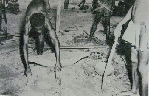 86 Abb. 5 Veröffentlicht 2012-08-23 mit 500 × 322 in Afrikanische Metallreifen als Wertmesser IV: konga – Beinstulpen der Bakutu in der Demokratischen Republik Kongo Abb. 5: Die frisch gegossene „Stulpenscheibe“ wird mit zwei flachen Hölzern aus der Gussform im Holz- trog herausgehoben und zur Abkühlung daneben auf den Boden gelegt. (Foto von Lamote, aus Maquet, 1965)