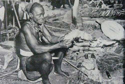 86 Abb. 2 Veröffentlicht 2012-02-09 mit 500 × 336 in Afrikanische Metallreifen als Wertmesser IV: konga – Beinstulpen der Bakutu in der Demokratischen Republik Kongo Aus den Bananenstrunk-Fasern wird ein Kissen geformt, um den heißen Schmelztiegel anfassen zu können. Rechts im Hintergrund der Holzbehälter, der die Gießmulde aufnehmen wird. (Foto von Lamote, aus Maquet, 1965)