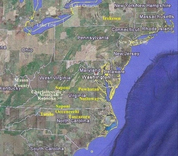 87-1-2012 ROANOKE Abb. 1 Veröffentlicht 2012-08-29 mit 606 × 531 in Roanoke – eine frühe Geldform in Virginia, USA Abb.1: Staatenkarte Ostküste der USA mit wichtigen Orten und erwähnten Indianerstämmen
