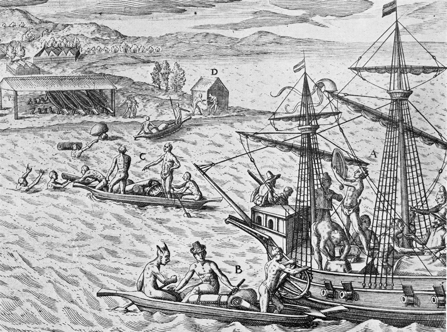 88-2-2012 Neptunes Abb. 4 (Groß) Veröffentlicht 2012-10-06 mit 1454 × 1080 in Neptunes: Gefäße aus Kupfer und Messing als Tauschwaren im europäischen Afrikahandel Abb. 4: Europäisches Handelsschiff, das vor der Guinea- Küste entladen wird. An Deck des Seglers hält ein Einheimischer eine runde Platte zur Prüfung auf Löcher gegen das Licht. Eine weitere Platte im Kanu im Vordergrund (aus Dow 1927 neben S. 26)